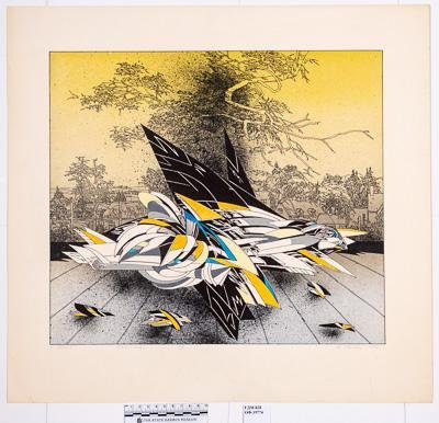 На листе горизонтального формата крупно изображена стилизованная цветная игрушка-птица, лежащая на крыше. За ней пейзаж с прозрачными деревьями и домами.