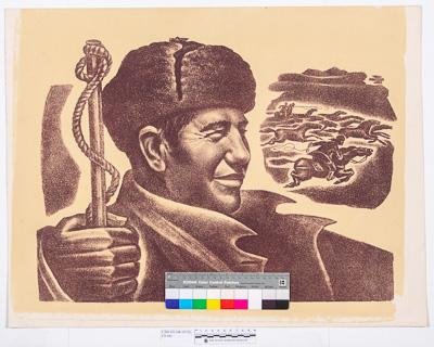 На листе горизонтального формата изображен поплечный портрет мужчины в шапке-ушанке в три четверти вправо с кнутом в руке. Справа изображен скачущий табун лошадей и погонщики по краям.