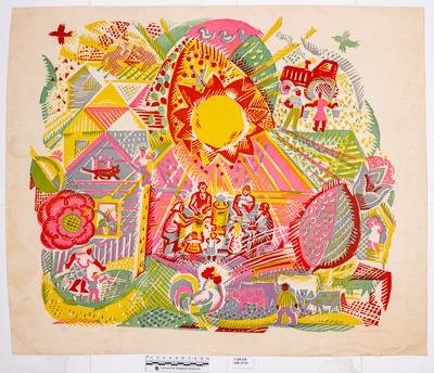 На листе горизонтального формата вверху в центре крупно изображено солнце с расходящимися лучами, вокруг красные стилизованные лепестки, орнаментальные мандолы. Вверху слева серые, желтые и розовые треугольники и красная птица. Вверху справа: мужчина, женщина, трактор, зеленая птица. Внизу слева на фоне избы женщина с ребенком, по фронтону избы идёт красная кошка, правее изображена семья за большим столом с самоваром. На первом плане крупно изображен петух, справа - пастух и стадо коров.