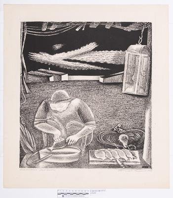 На листе вертикального формата изображена жанровая сцена с женщиной, чистящей рыбу, рядом на доске лежат пять рыб и нож, висит керосиновая лампа. Женщина стоит под навесом, на дальнем плане дома, море и черное небо с белыми облаками.