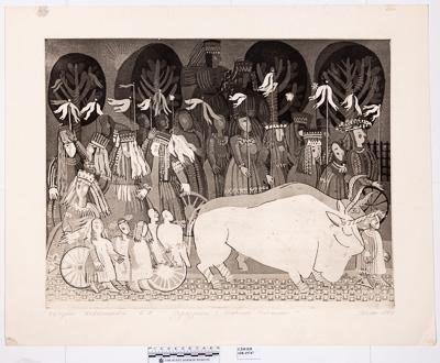 На листе горизонтального формата на темном фоне, где угадываются деревья и силуэты людей. На среднем плане плотно стоящая группа людей в головных уборах с лентами и с шестами с ленточками. На первом плане упряжка с двумя белыми быками, женщина и дети на телеге.
