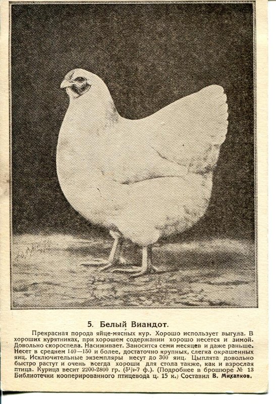 На открытке вертикального формата на светлом фоне воспроизведено фото белой курицы боком влево. На нижнем белом поле надпись, сообщающая о породе. Оборот разделён вертикальной чертой.