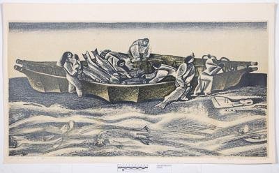 На листе вытянутого горизонтального формата крупно изображена лодка с рыбой. Слева женщина с ребенком, в центре за лодкой мужчина с ружьем, справа два мужчины, один из них несёт большую рыбу. На первом плане в серо-голубой воде изображены ластоногие. У животного на первом плане во рту камбала. Литография в серо-синих и коричневых тонах.