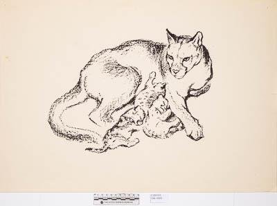 Пума с детенышами. Литография