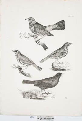Четыре птицы. Полевой дрозд, обычный дрозд, краснокрылый дрозд, черный дрозд. Гравюра