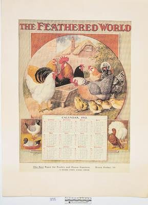 На листе вертикального формата сделан коллаж из рисунков с курами и голубями. Вверху в неправильном круге на фоне прямоугольника изображена сцена с петухом, курами и цыплятами у кормушки на фоне сельского дома. Ниже в центре календарь в прямоугольнике горизонтального формата. Слева и справа от него в прямоугольниках изображены по два голубя разных пород.