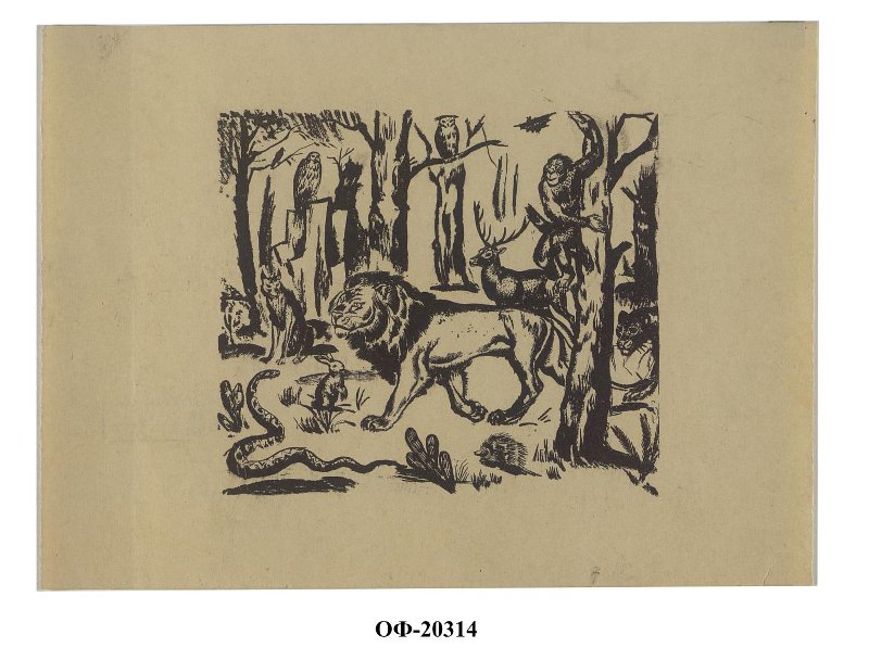 На листе горизонтального формата изображена многофигурная композиция с животными в лесном пейзаже: змея, заяц, волк, лев, олень, еж, обезьяна, летучая мышь, филин и другие птицы.