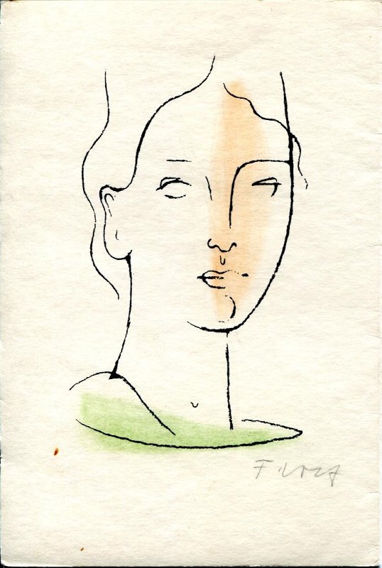 На листе вертикального формата изображен погрудный портрет неизвестной женщины с правильными чертами лица. Её волосы разделены прямым пробором и намечены ниспадающими мягкими волнистыми линиями. Лицо женщины справа оттенено овальным вертикальным пятном растушеванного красного карандаша, воротник одежды оттенен горизонтальным пятном растушёванного зеленого карандаша. Лист сложен пополам на манер открытки.