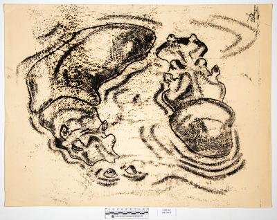 На листе горизонтального формата изображены два бегемота в воде. Вид сверху на расположенных в противоположных направлениях животных, вокруг них кругом расходятся волны. На обороте карандашом обведены силуэты бегемотов, просвечивающие с лицевой стороны.