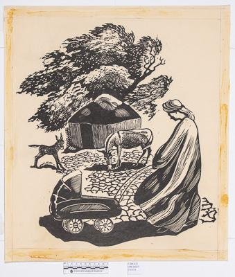 На листе горизонтального формата на фоне окна, на подоконнике изображен большой букет из полевых цветов, стоящий в чугунке. Вдали сельский пейзаж. Справа в небе радуга.