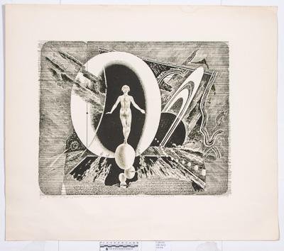 На листе горизонтального формата аллегорическая композиция из планет. На первом плане на маленьких светлых шарах на черном фоне изображена белая обнаженная фигура человека.