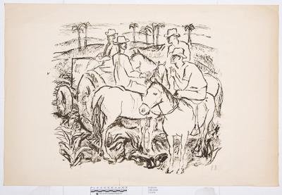 На листе горизонтального формата изображены беседующие, собравшиеся в круг, четверо людей в широкополых шляпах: три всадника на лошадях и тракторист на маленьком колёсном тракторе. Вдали редкие пальмы.