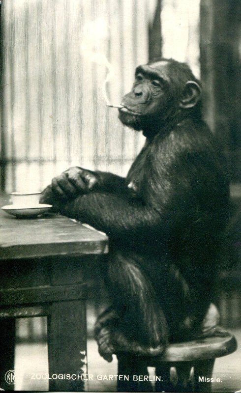 Шимпанзе "Мисси" курит. Берлинский зоопарк. Открытка