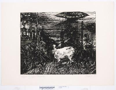 На листе горизонтального формата изображен темный индустриальный пейзаж с трубами, проводами и эллиптическим объектом с круглыми окошками. на первом плане боком головой в фас стоит белый козел.