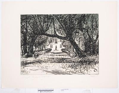 На листе горизонтального формата изображен пейзаж со старыми черными стволами деревьев на первом плане. В центре аллея с низкими кустами, ведущая к памятнику, стоящему на фоне фасада музея, полускрытого ветвями деревьев.