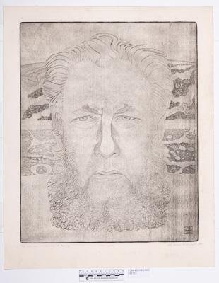 На листе почти квадратного формата крупно изображено лицо мужчины с бородой, кустистыми бровями, с волосами зачесанными назад, открывающими высокий лоб.