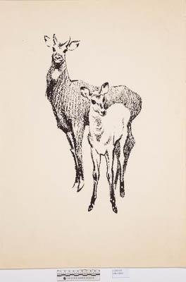 На листе вертикального формата изображены изображены стоящие антилопа с детёнышем. Светлая фигура детёныша на фоне пестрого фона тела антилопы.