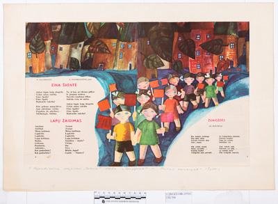 На листе горизонтального формата изображена улица с небольшими разноцветными домами, большие листья. По улице идут голубоглазые дети с красными флажками. Справа и слева внизу стихи.