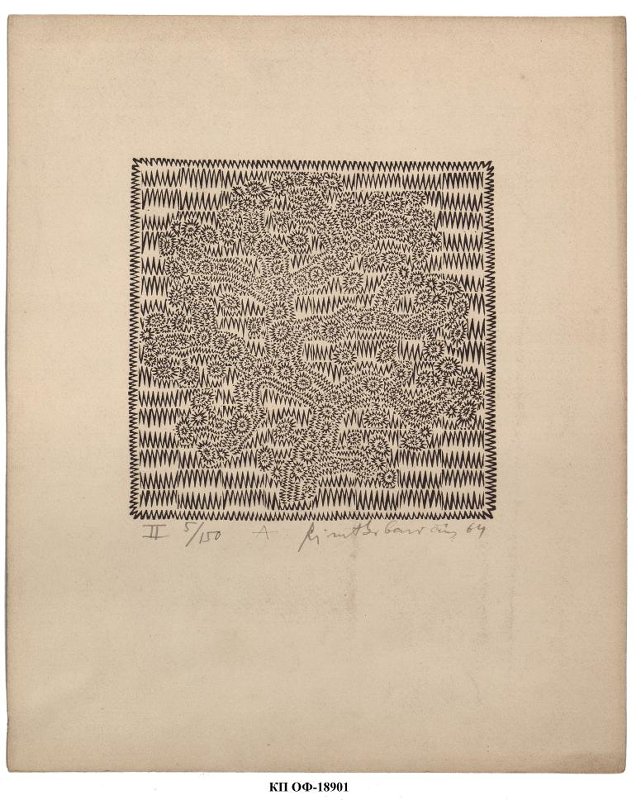 На листе вертикального формата квадратный монохромный оттиск с острыми волнистыми линиями, собранными короткими отрезками попарно, создающими мерцающий узор фона. Такая же линия обрамляет оттиск. Из таких же разнонаправленных линий создано изображение коралла.