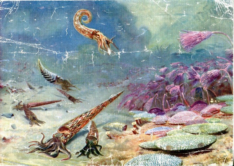 На листе горизонтального формата изображено дно моря с морскими лилиями и сотовыми кораллами справа, головоногие моллюски с прямой и загнутой раковиной.