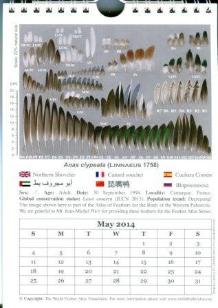 Лист из календаря, собранного на пружинку. Вверху на сером фоне изображены перья широконоски в размере 22% натуральной величины. Внизу название вида на латыни и на 6 языках, ниже таблица календаря на май 2014.