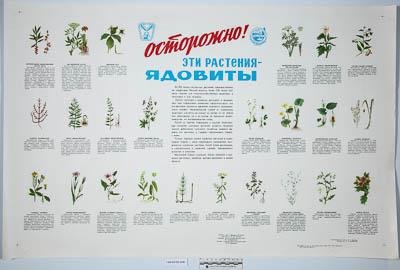 Плакат горизонтального формата с изображением ядовитых растений и описаниями к ним. Вверху эмблемы Областной постояннодействующей сельскохозяйственной выставки в Омске и ВООП. Описаны растения: волчеягодник обыкновенный, вех ядовитый, вороний глаз, солерос травянистый, авран лекарственный, листовень лекарственный, аконит высокий, горчица полевая, куколь обыкновенный, вьюнок полевой, ярутка полевая, хвощ полевой, молочай лозный, лютик ядовитый, пикульник ладанный, болиголов пятнистый, калужница болотная, звезчатка злачная, дурман обыкновенный, белокрыльник болотный, паслен трехцветный, паслен сладко-горький, манник водяной, белена черная.