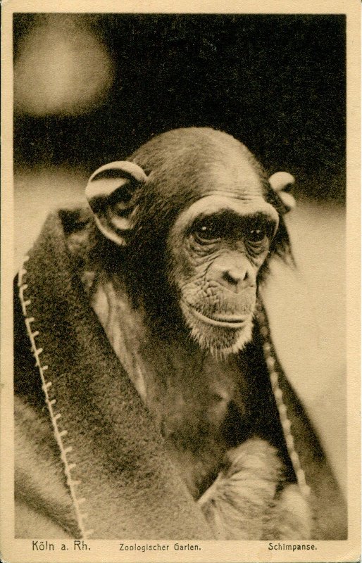 Портрет шимпанзе в накидке. Кельнский зоопарк. Открытка