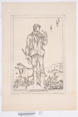 На листе вертикального формата портрет молодого человека в полный рост. У него в одной руке молоток на длинной ручке, в другой руке цветок. Слева за ним собака, справа корабль и три птицы над ним.