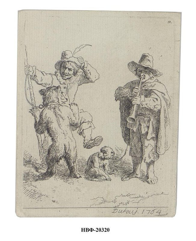 На листе вертикального формата слева спиной к зрителю изображен стоящий на задних лапах медведь с ошейником и поводком. Поводок прикреплен к шесту, который держит пляшущий дрессировщик медведя. Справа стоит музыкант в плаще, он играет на дудочке, к его поясу пристегнут поводок, а у его ног сидит обезьянка. Оба мужчины в широкополых шляпах. звери смотрят друг на друга.