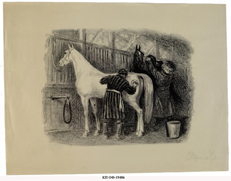 На листе горизонтального формата в стойле на фоне изгороди изображены две лошади, белая и черная, и два мальчика-конюха. Один чистит белую лошадь, другой седлает черную. Справа стоит ведро.