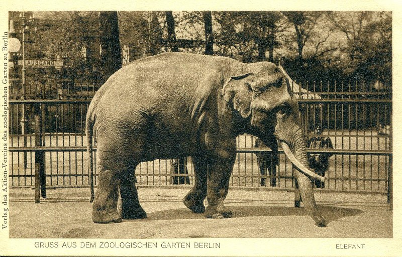 Открытка горизонтального формата с изображением слона в вольере. Не была в обращении (нет надписей и почтовых штемпелей). Оборотная сторона разделена вертикально. Вверху справа штамрп антикварного магазина.