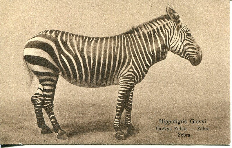 Открытка горизонтального формата с изображением зебры на условном фоне. Не была в обращении (нет надписей и почтовых штемпелей). Оборотная сторона разделена вертикальной чертой, слева – место для письма, справа – для адреса и для марки. Вверху справа штамп антикварного магазина.