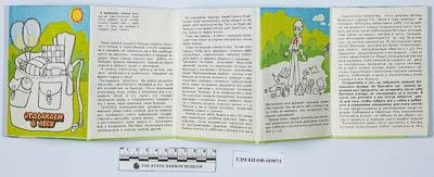 С одной стороны - плакат с изображением двух пионеров с лейкой и лопатой на фоне пейзажа с дорогой. На плакате подробная надпись о том, что запрещено делать в лесу. С другой стороны - детская книжка-раскладушка с подробным рассказом и иллюстрациями о том, как вести себя в лесу.