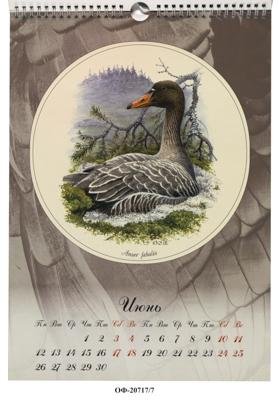 Лист календаря, собранного на пружинку. На листе вертикального формата на фоне фотографии перьев в тондо воспроизведен рисунок с изображением сидящего гуменника на фоне еловой ветки и леса вдалеке. Внизу календарь на июнь.
