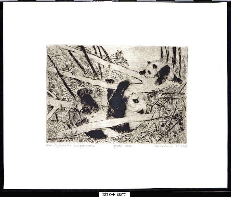 В зарослях папоротника. Из серии "Панды". Гравюра