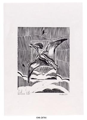 На листе вертикального формата изображен условный пейзаж, решенный горизонтальными плавными линиями и жирной штриховкой, в пейзаже черные силуэты птерозавров. В центре композиции на фоне прямоугольника с белым контуром изображен летящий птерозавр - цикнорамф с распростёртыми крыльями.