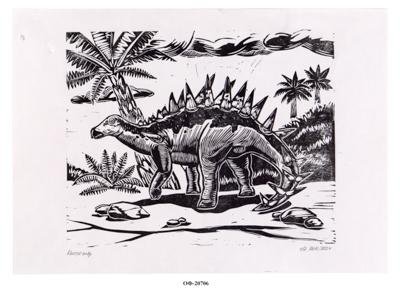 На листе горизонтального формата на фоне пейзажа с папоротниками и пальмами изображен идущий кентрозавр.