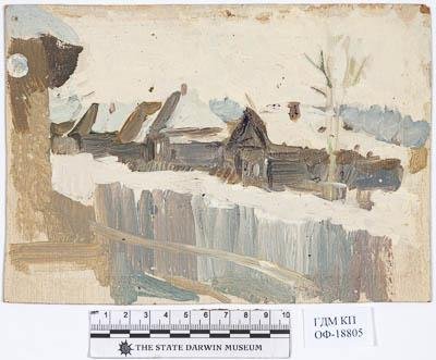 Композиция горизонтального формата, изображена деревенская улица зимой. На первом плане - деревянный забор, слева виднеется угол дома. Далее - засыпанная белым снегом улица, за которой виднеется ряд одноэтажных деревянных домиков с двускатными и четырехскатными крышами. Справа виднеется тонкое деревце, растущее за оградой у домика. Линия горизонта расположена чуть выше середины листа, небо белое.