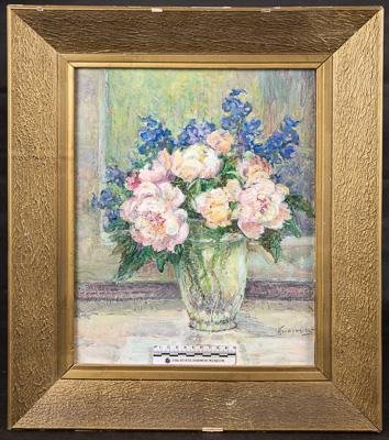 Композиция вертикального формата. Изображен букет из светло-розовых пионов и синих дельфиниумов, стоящий в стеклянной вазе на подоконнике у окна.
