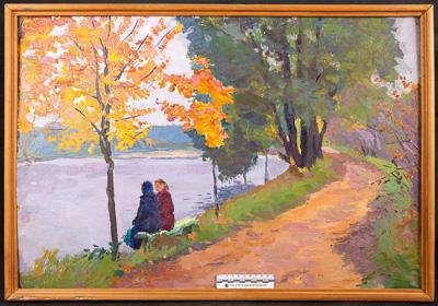 Композиция горизонтального формата, основная колористическая гамма теплая. Изображена осенняя аллея на берегу водоема, слева на переднем плане на светло-зеленой скамейке сидят спиной к зрителю две женщины. Слева - женщина в черной одежде и черном платке на голове, справа от нее женщина в темно-красной одежде с непокрытой головой. с обеих сторон от скамейки растут два лиственных дерева с золотисто-оранжевой листвой. Справа вдаль по берегу водоема уходит дорога, окруженная деревьями с обеих сторон. Вода светло-фиолетового цвета, дальний берег голубовато-зеленый. Небо светло-серое. Линия горизонта проходит выше середины картины.