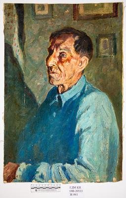 Композиция вертикального формата, поясной портрет сидящего пожилого мужчины в профиль влево. Одет в голубую рубаху, на голове - короткие темные волосы. На заднем плане зеленовато-серая стена с ромбовидным орнаментом на обоях и три висящие на ней рамки с фотографиями.