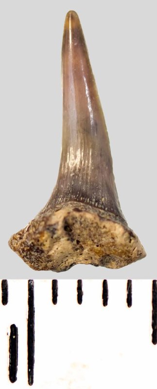 Зуб. Акула. Eostriatolamia subulata (Agassiz, 1843). Классификация: Хордовые Chordata, Позвоночные Vertebrata, Хрящевые рыбы Chondrichthyes, Пластиножаберные Elasmobranchii, Акулы Selachii, Ламнообразные Lamniformes, Песчаные акулы Odontaspididae
