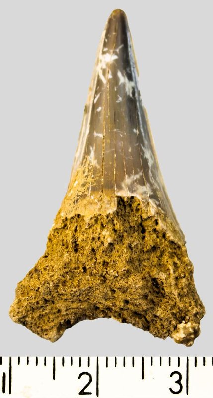 Зуб. Акула. Otodus subserratus (Agassiz, 1843). Классификация: Хордовые Chordata, Позвоночные Vertebrata, Хрящевые рыбы Chondrichthyes, Пластиножаберные Elasmobranchii