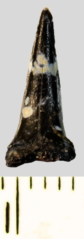 Зуб. Акула. Striatolamia sp. Классификация: Хордовые Chordata, Позвоночные Vertebrata, Хрящевые рыбы Chondrichthyes, Пластиножаберные Elasmobranchii
