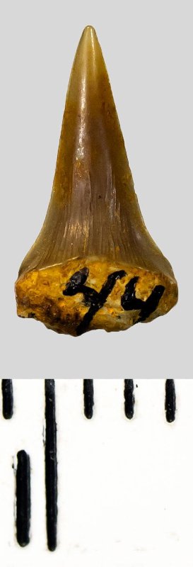 Зуб (фрагмент). Акула. Scapanorhynchus sp. Классификация: Хордовые Chordata, Позвоночные Vertebrata, Хрящевые рыбы Chondrichthyes, Пластиножаберные Elasmobranchii, Акулы Selachii, Ламнообразные Lamniformes