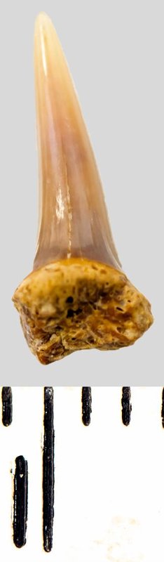 Зуб. Акула. Eostriatolamia subulata (Agassiz, 1843). Классификация: Хордовые Chordata, Позвоночные Vertebrata, Хрящевые рыбы Chondrichthyes, Пластиножаберные Elasmobranchii, Акулы Selachii, Ламнообразные Lamniformes, Песчаные акулы Odontaspididae