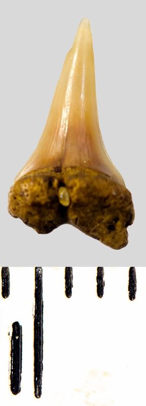 Зуб. Акула. Eostriatolamia subulata (Agassiz, 1843). Классификация: Хордовые Chordata, Позвоночные Vertebrata, Хрящевые рыбы Chondrichthyes, Пластиножаберные Elasmobranchii, Акулы Selachii, Ламнообразные Lamniformes, Песчаные акулы Odontaspididae