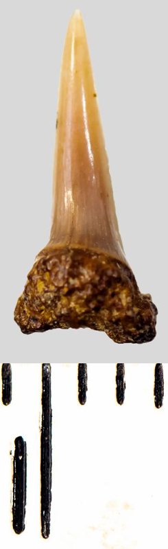 Зуб. Акула. Eostriatolamia subulata (Agassiz, 1843). Классификация: Хордовые Chordata, Позвоночные Vertebrata, Хрящевые рыбы Chondrichthyes, Пластиножаберные Elasmobranchii, Акулы Selachii, Ламнообразные Lamniformes, Песчаные акулы Odontaspididae