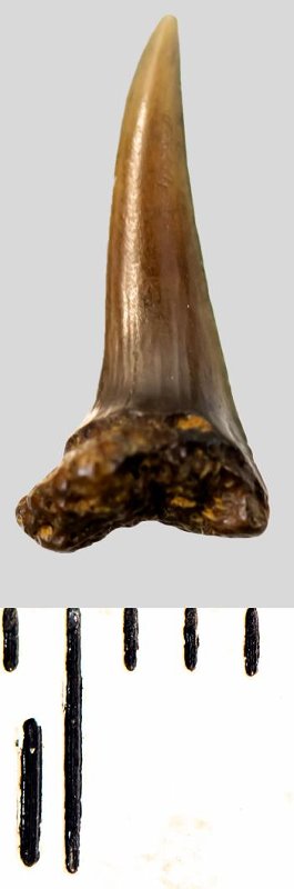 Зуб. Акула. Eostriatolamia subulata (Agassiz, 1843). Классификация: Хордовые Chordata, Позвоночные Vertebrata, Хрящевые рыбы Chondrichthyes, Пластиножаберные Elasmobranchii, Акулы Selachii, Ламнообразные Lamniformes, Песчаные акулы Odontaspididae