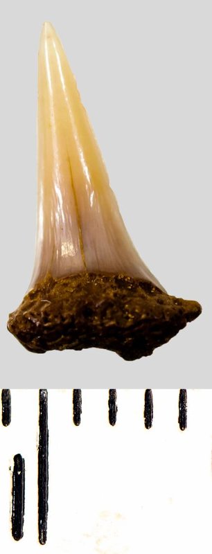 Зуб. Акула. Eostriatolamia subulata (Agassiz, 1843). Классификация: Хордовые Chordata, Позвоночные Vertebrata, Хрящевые рыбы Chondrichthyes, Пластиножаберные Elasmobranchii, Акулы Selachii, Ламнообразные Lamniformes, Песчаные акулы Odontaspididae